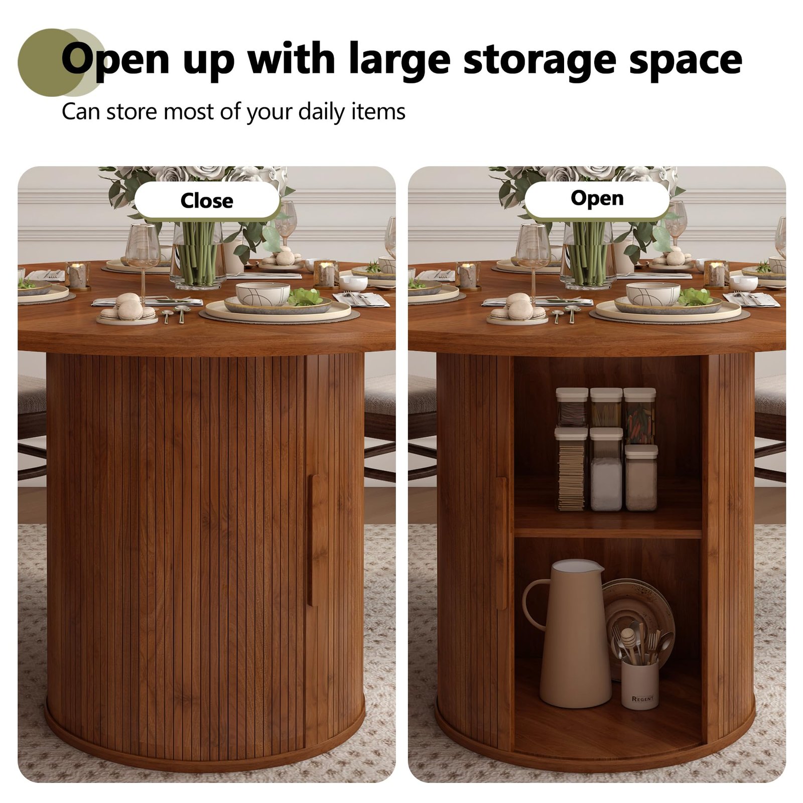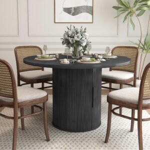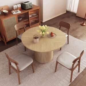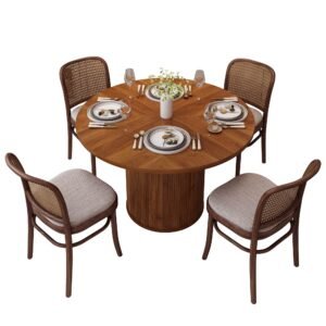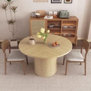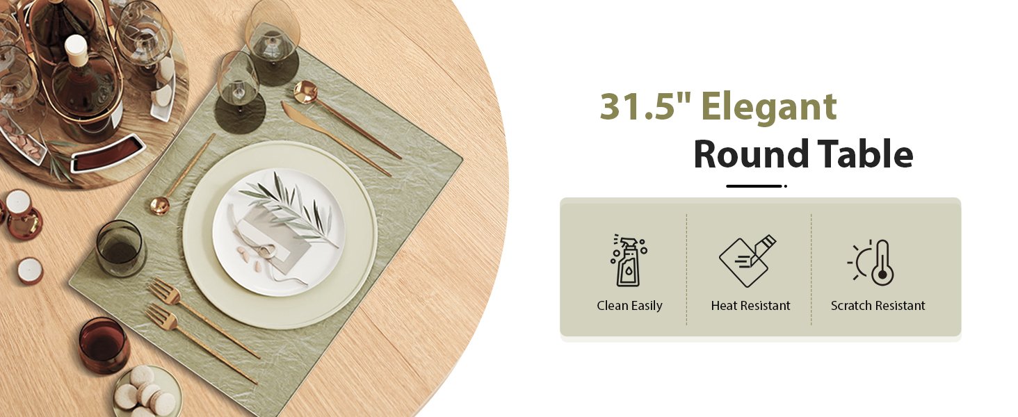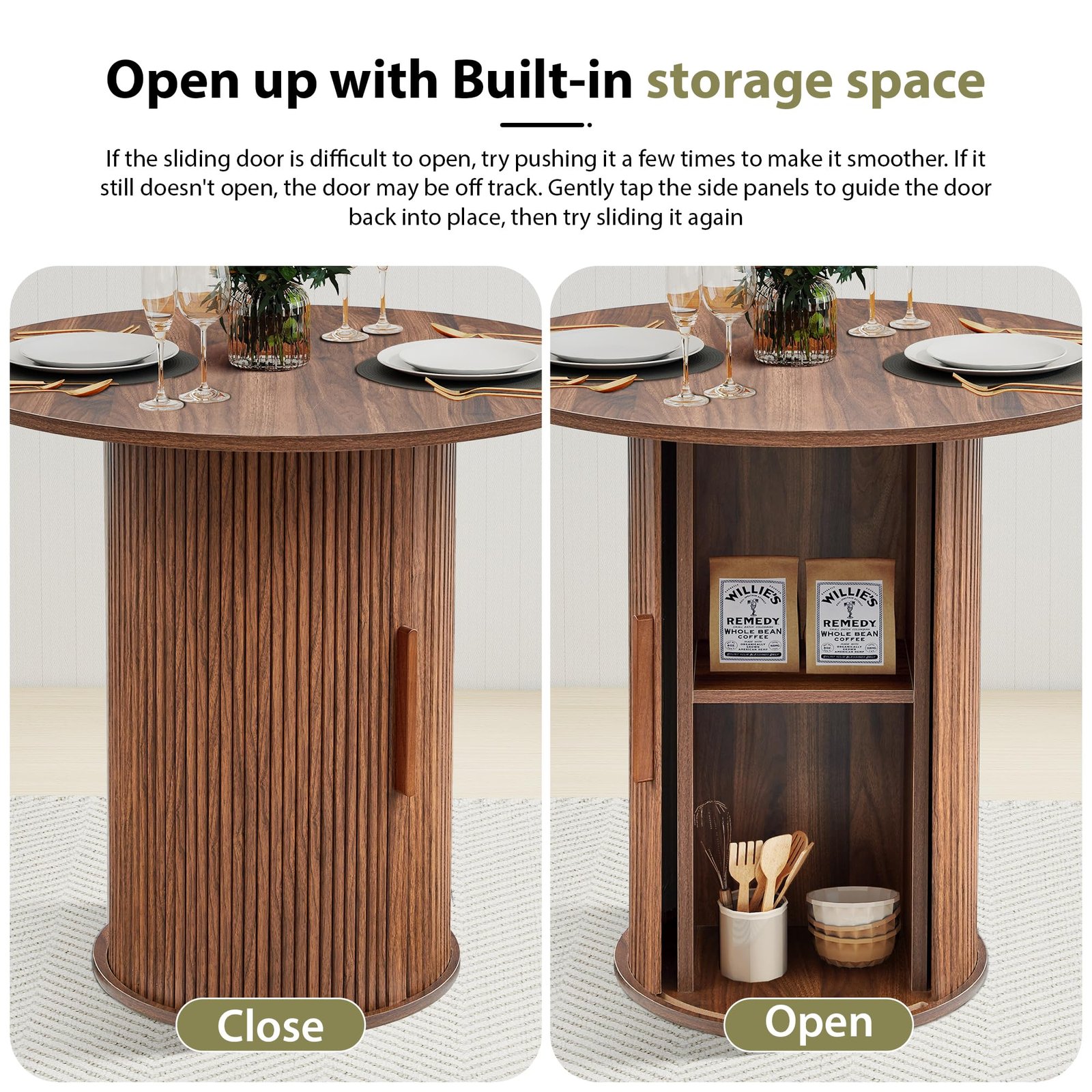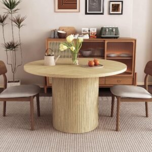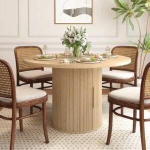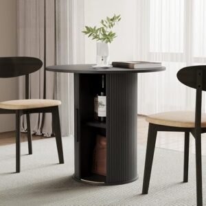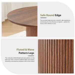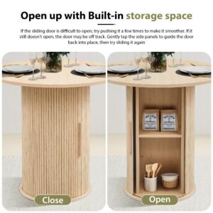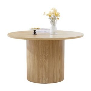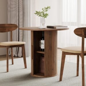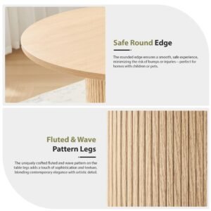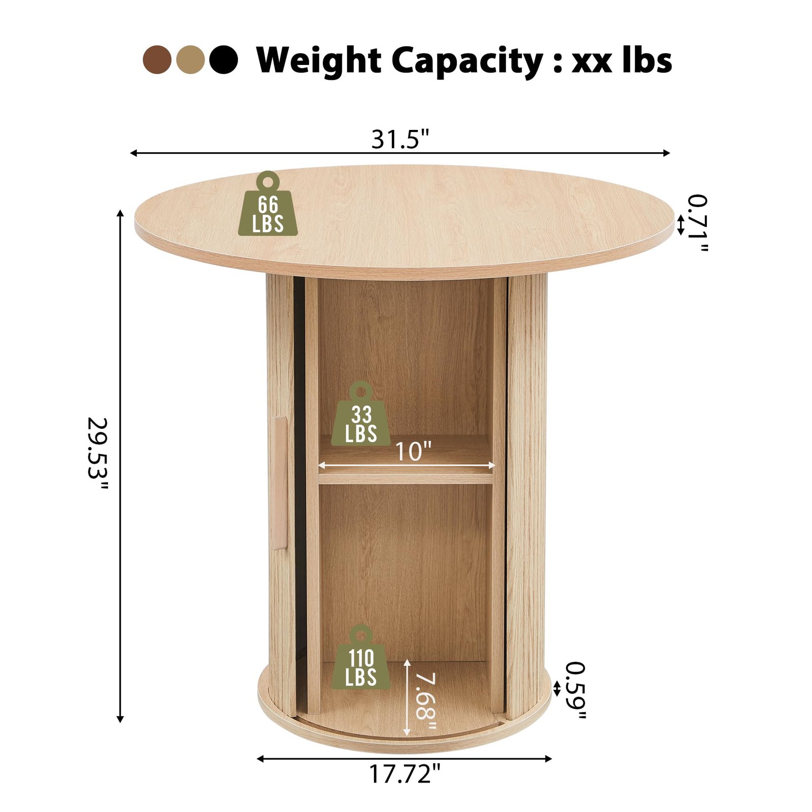Brand:weselon Product Dimensions:31.5″D x 31.5″W x 29.5″H Maximum Weight Recommendation:66 Pounds Color:Natural Oak 31.5″+hidden Storage Style:Modern Item Weight 44 Pounds:Frame Material Metal :Item Weight 44 Pounds :Frame Material Metal Top Material Type Resin:Shape Round :Top Material Type Resin :Shape Round · 【Elegant & Compact Design】This 31.5 inch round dining table for 2-4 people features a solid one-piece circular tabletop, unlike split-panel alternatives. Its MDF finish and wood veneer surface offer a modern accent with retro farmhouse charm, making it a stylish addition to small kitchens, apartments, or dining nooks. · 【Sturdy Fluted Pedestal Base】Supported by a metal frame and fluted wood strip pedestal, this small circle dining table provides both style and strength. The mid-century inspired wood strip base ensures long-lasting durability while adding a decorative, sculptural touch to any home or living room setting. · 【Smart 2-Tier Storage Shelf】Designed with built-in dual-layer storage, this round kitchen table keeps dining essentials, books, or decor easily accessible. Whether used for daily meals or as a leisure coffee table or center table, it blends storage and function in compact spaces. · 【Versatile for Any Occasion】Perfect for modern or farmhouse interiors, this small dining table works great in home kitchens, living rooms, or office lounges. Use it for casual dinners, coffee breaks, or as a guest table for light meetings. Its compact size is ideal for apartments and small spaces. · 【Easy Assembly & Maintenance】Dimensions: 31.5″ x 29.5″. The sealed tabletop is water-resistant and easy to clean with a damp cloth. Assembly is quick and straightforward with detailed instructions. We’re here to help with any questions during setup.