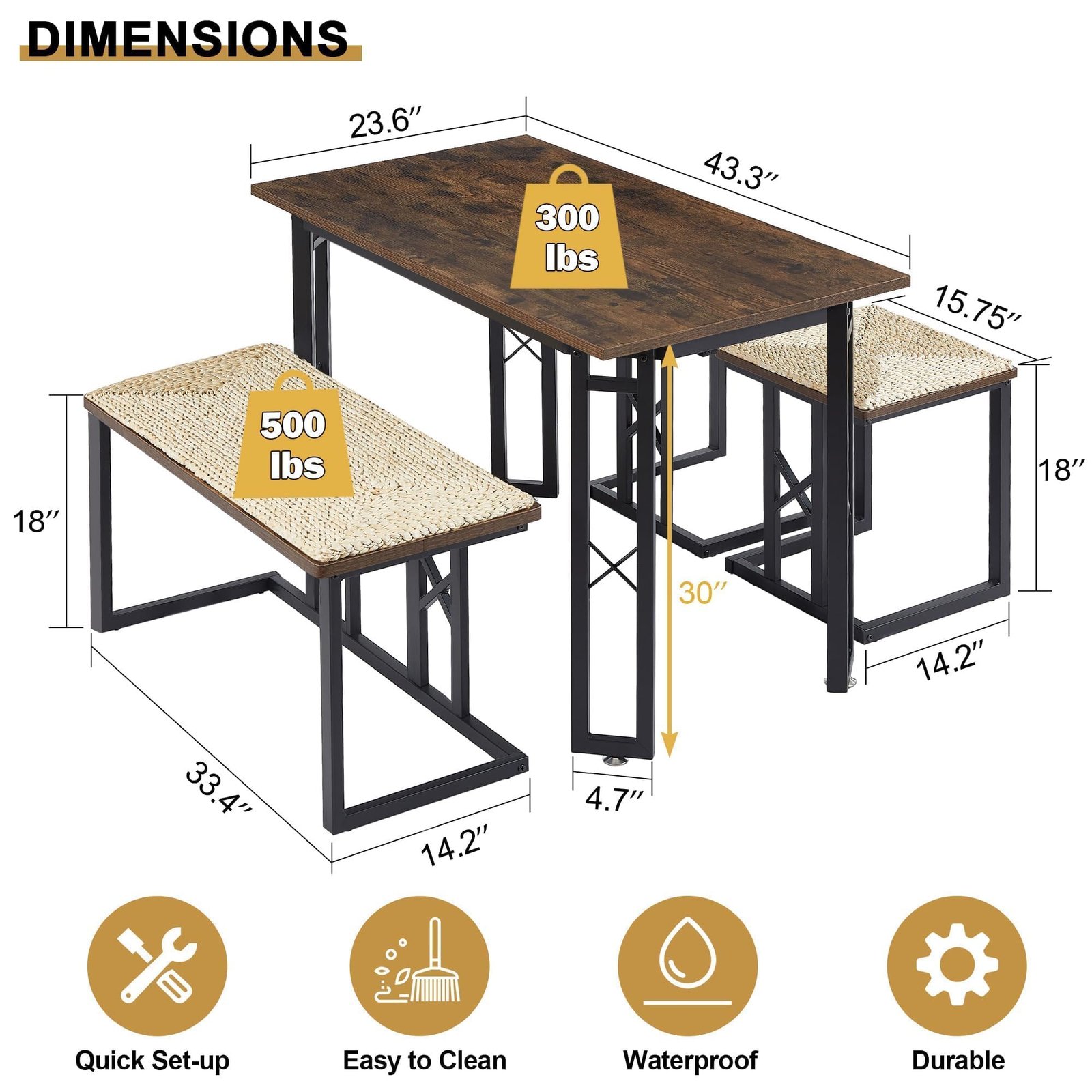 Color:Dark Brown Brand:VECELO Size:43.3in Item Depth:43.3 inches Item dimensions L x W x H:43.3 x 23.6 x 30 inches Item Weight 56 Pounds:Style Farmhouse :Item Weight 56 Pounds :Style Farmhouse Assembly Required Yes:Shape Rectangular :Assembly Required Yes :Shape Rectangular Product Care Instructions:Wipe with Dry Cloth Material:Wood, Alloy Steel Manufacturer:VECELO UPC:840408986403 Item Weight:56 pounds Product Dimensions:43.3 x 23.6 x 30 inches Country of Origin:China Item model number:T4D4TC16BRN-V2 ASIN:B0FG7WCYTC Date First Available:July 1, 2025 · 【Space Saving Design】– All benches can be conveniently moved under the table, making these benches space-saving and convenient when not in use. And also help avoid unexpected tripping when preparing and delivering cuisine dishes in kitchen. · 【Multi-functional Dining Table Sets】– Perfectly used as a dining table, study desk for kids and working table, a good choice for all kinds of daily using in your home. vintage industrial style kitchen dining table and benches set with buho wicker knotcushions, make your home modern and fashionable. · 【Suitable Size&Load Capacity】 – Kitchen Dining Table Sets Dimensions: This dining table measures: 43.3'' L x 23.6'' W x 30'' H, Load Capacity: 300 LBS; Long Bench: 33.4'' W x 14.2'' D x 18'' H; Stools: 15.75'' W x 14.2'' D x 18'' H, Load Capacity: 500 LBS. · 【Adjustable Feets and Comfortable Knotcushions】– All 3 Benches with wicker mats, comfortable, breathable and industrial designed, make your dinner time more relaxing. Adjustable Feet pads can help change the height of dining table to match your position, also won't be slippery all the dining time. Heavy-duty steel frame with tabletop MDF wooden board for greater stability and sturdiness. · 【Easy to Assemble】 – The simple designed structure of this dining table set and chairs make it easy to install. All parts and tools are included and clearly labeled, making assembly a breeze.
