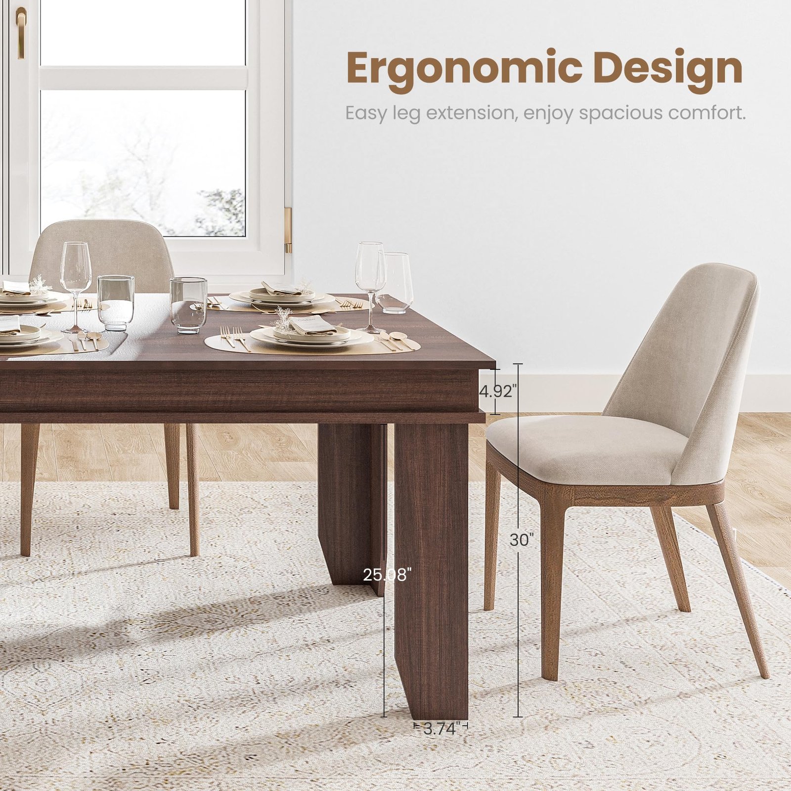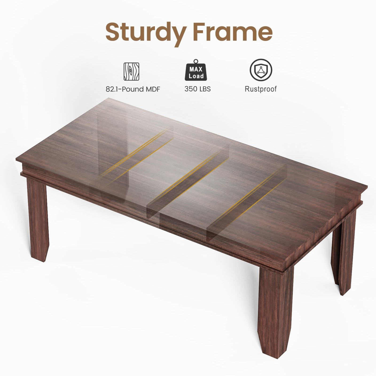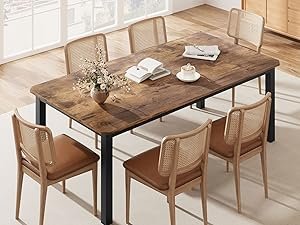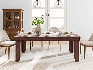 Color:Brown Brand:GarveeHome Item dimensions L x W x H:77.36 x 21.26 x 4.53 inches Material:Engineered Wood Manufacturer:GarveeHome Item Weight 88.4 Pounds:Style Farmhouse :Item Weight 88.4 Pounds :Style Farmhouse Assembly Required Yes:Shape Rectangular :Assembly Required Yes :Shape Rectangular UPC:199108821225 Item Weight:88.4 pounds Product Dimensions:77.36 x 21.26 x 4.53 inches Country of Origin:China Item model number:GarveeHome-FarmhouseTable ASIN:B0DTY4KMJC Date First Available:January 24, 2025 · [Large Dining Table] This long wooden dining table is perfect for seating 6 to 8 people, making it an ideal choice for family gatherings.This kitchen table measures 70.87" L x 35.4" W x 30" H, and the thickest part of the tabletop is 4.9 inches. It is made of MDF wood with a dust-proof and waterproof surface, providing your family with a pleasant dining experience! · [Sturdy Table Legs] Formed with 2" x 2" extra-wide MDF planks to create a V-shaped structure, this dining table for 6 brings unprecedented strong support and excellent stability.Specially designed non-slip foot pads can effectively protect your floor from scratches while moving this kitchen table for 4, so that you can enjoy your dinner at peace. · [Ergonomic Design] Designed with ergonomic principles, this dining table for 8 provides a comfortable height and a spacious dining area.The dining room table for 6 offers a convenient 30-inch height for stretching your legs. And it can easily be paired with chairs or benches, making it an ideal choice for dining or conference purposes. · [Easy to Put Together] Each kitchen & dining room table comes with clear and detailed instructions and installation tools, and every screw and accessory is labeled with corresponding numbers, making it remarkably easy to assemble. This kitchen room table is especially suitable for DIY enthusiasts, allowing for a hassle-free installation process. · [What You Get] A Dining Table, Chairs Not Included.