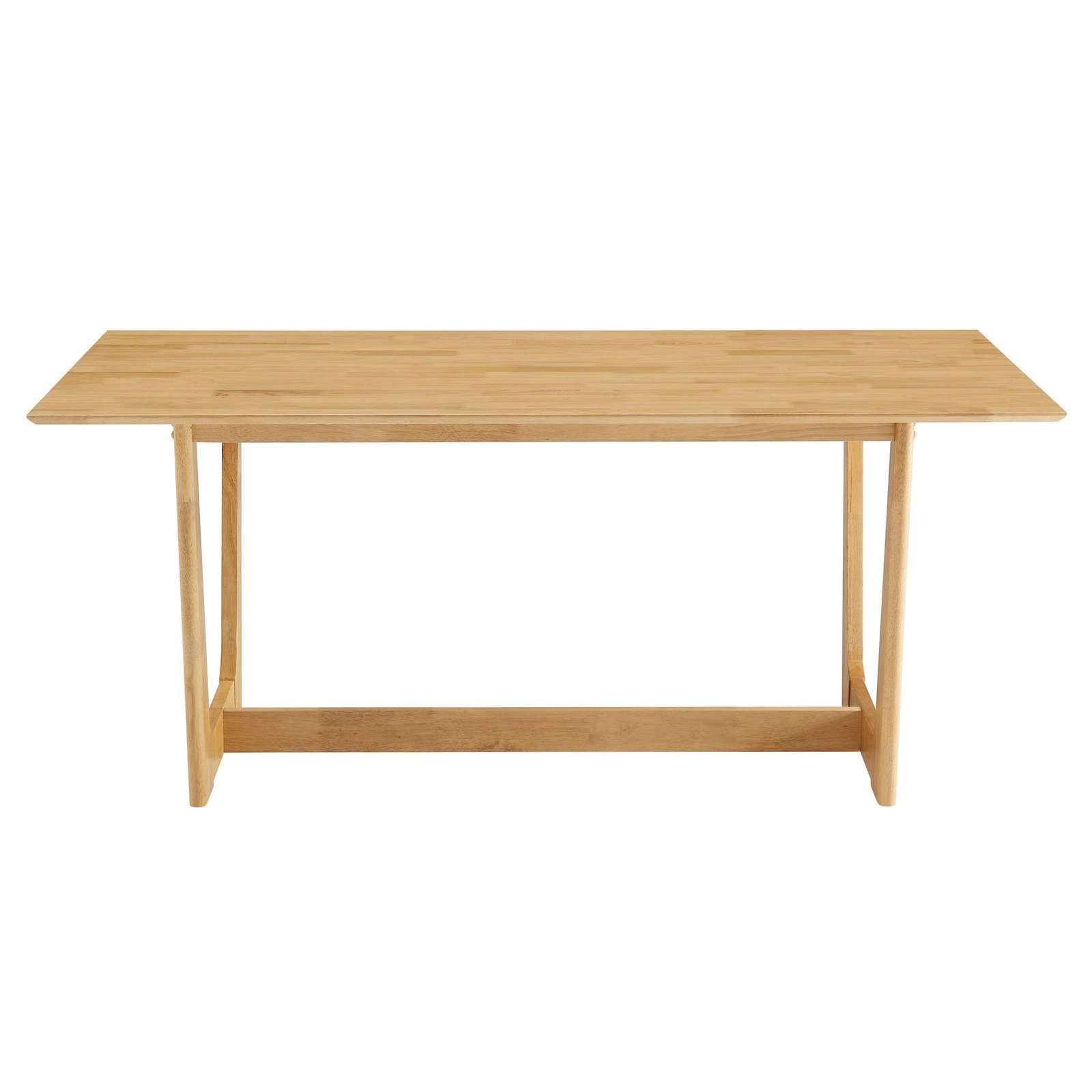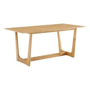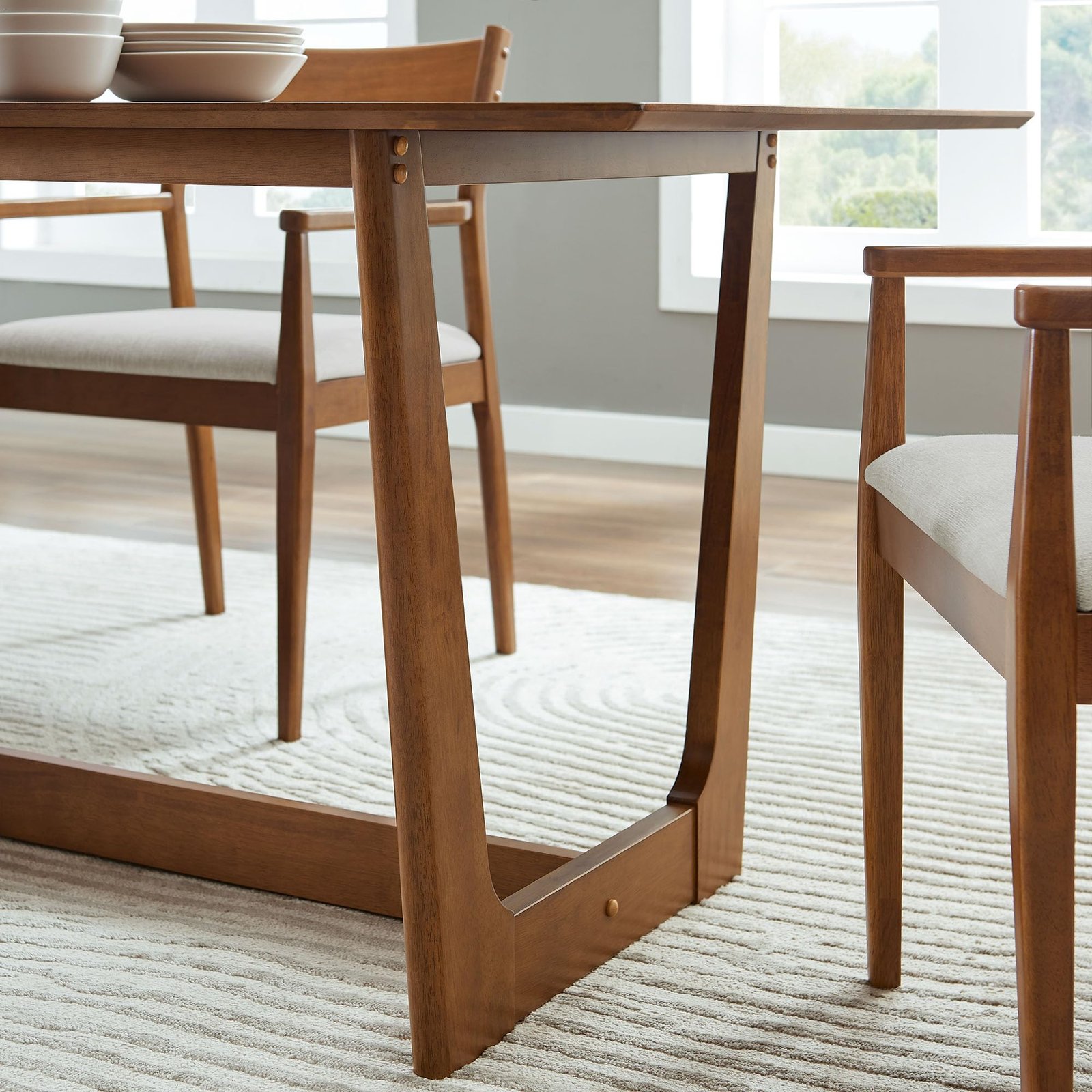 Adorn your dining space with the Solara Wood Dining Table. Seating six comfortably, this 71 inch dining table is crafted from premium rubberwood. The natural wood finish highlights the rich grain patterns, offering a warm, inviting rectangle table for meals and gatherings. This modern kitchen table's legs are a standout feature with a unique, modern look. Each leg angles outward from the floor to the underside of the tabletop, forming a bold U shape. The legs are connected by a horizontal support beam, which adds stability and strength to the mid-century modern table’s design. Perfect for use in the kitchen or dining room, this 6-person dining table provides ample legroom and a smooth, easy-to-clean tabletop, and can also double as a conference table for your home office. Make the Solara Minimalist Dining Table the centerpiece of your home, combining ageless beauty with everyday practicality. Assembly is simple with clear instructions. Weight Capacity: 440 lbs.