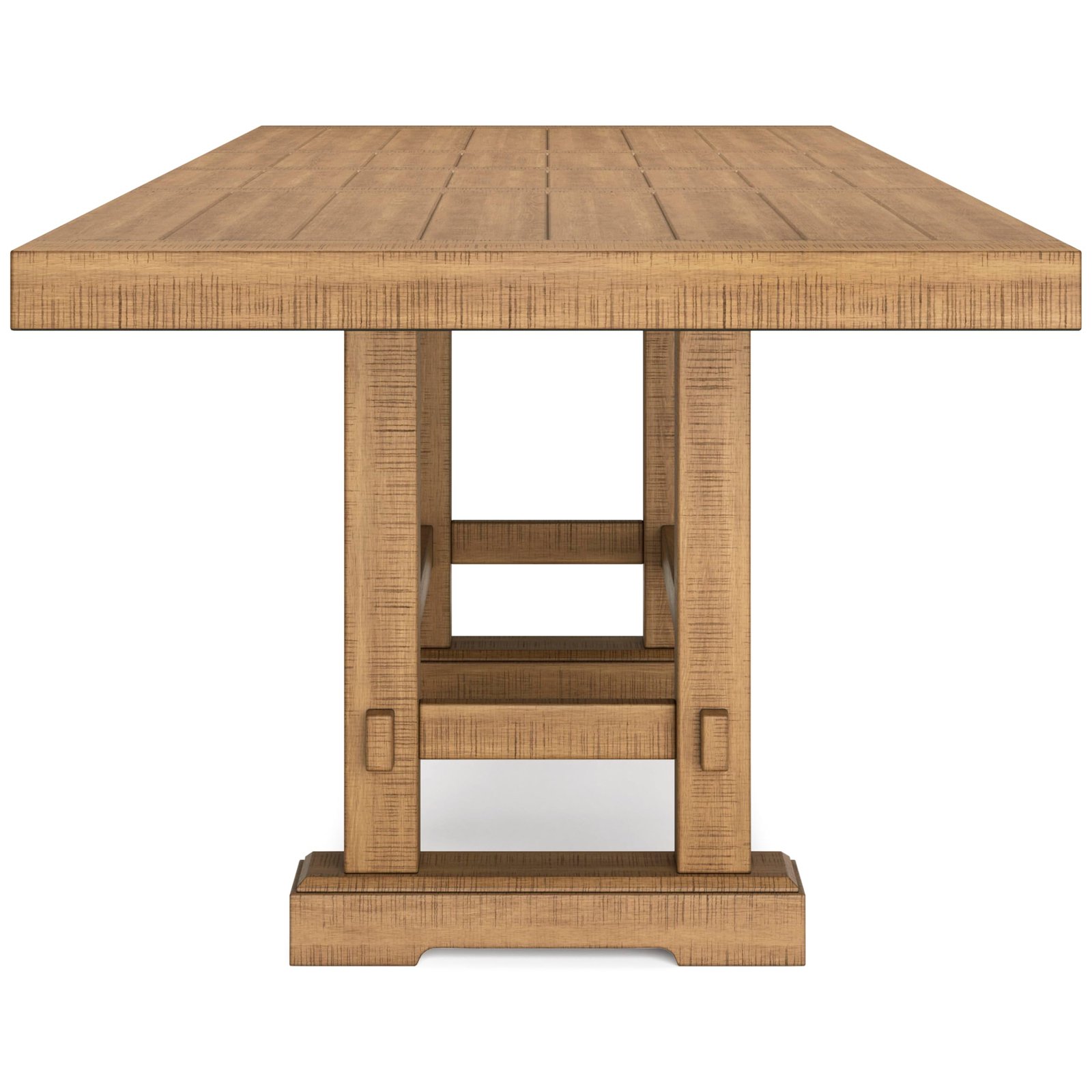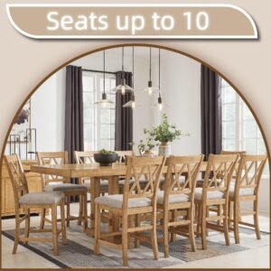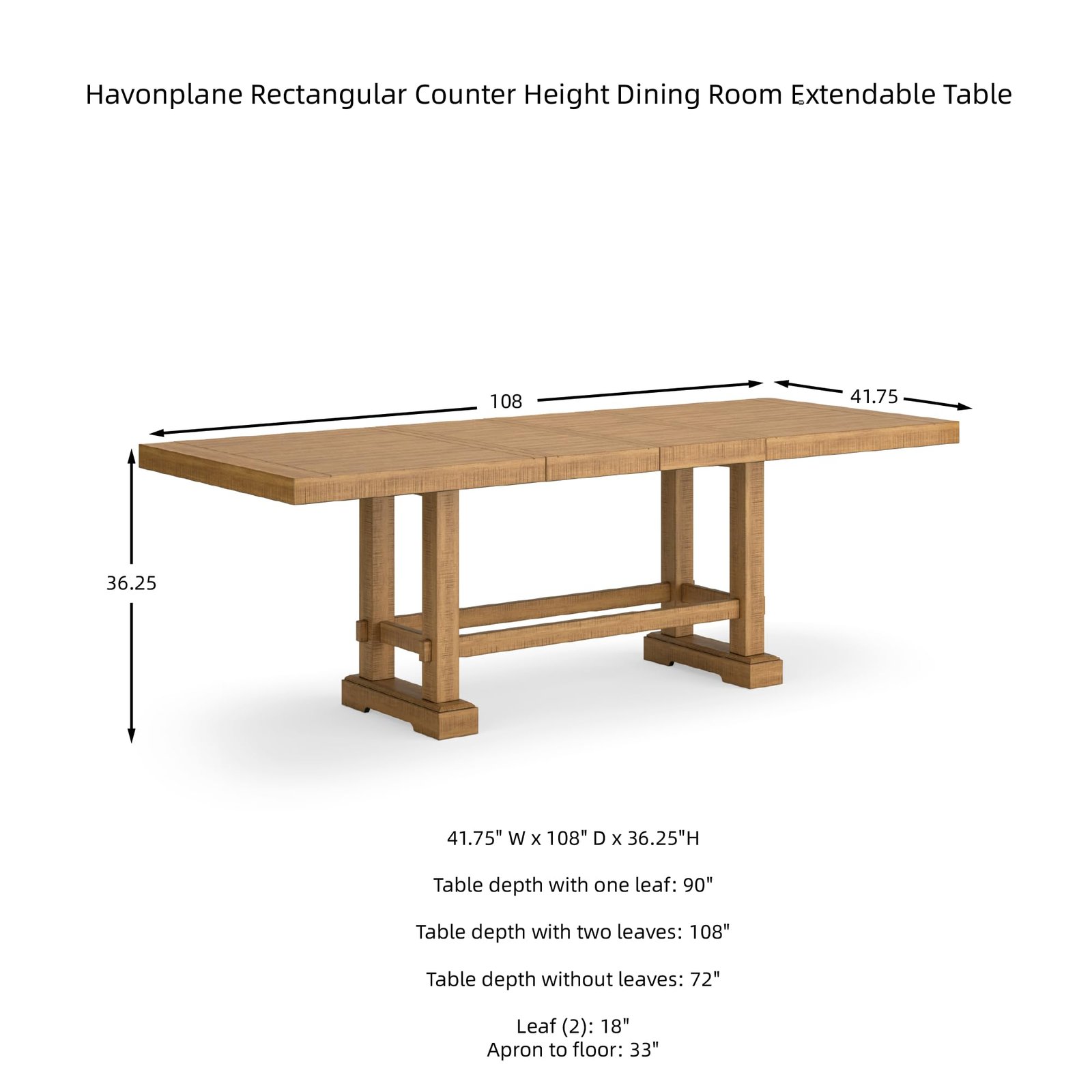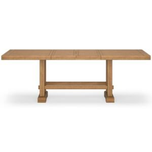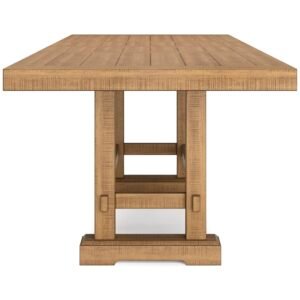 Brand:Signature Design by Ashley Product Dimensions:41.75"D x 108"W x 36.25"H Color:Light Brown Product Care Instructions:Wipe with Dry Cloth, Wipe with Damp Cloth Recommended Uses For Product:Dining Item Weight 180 Pounds:Frame Material Wood :Item Weight 180 Pounds :Frame Material Wood Top Material Type Engineered Wood:Shape Rectangular :Top Material Type Engineered Wood :Shape Rectangular · DINING EXTENSION TABLE: This counter height dining table is a favorite choice for everyday living and casual rustic interiors. Removable leaves make room for up to 10 at breakfast and dinner · QUALITY CRAFTED: Made with rubberwood solids, distressed pine veneers and MDF substrates. Distressed light brown pine finish. Double trestle base with solid wood stretcher. 2 removable center leaves · CASUAL FLAIR: Offering plenty of seating space, it's your answer for everyday living & impromptu guests. Distressed light brown pine finish & double trestle base are deliciously charming & versatile · SEATS UP TO 10: Measures 41.75" W x 72" D x 36.25" H without leaves. Table depth with one leaf: 90". Table depth with two leaves: 108". Apron to floor: 33". Chairs not included, sold separately · ASSEMBLY REQUIRED: Easy-to-follow instructions and hardware included. Two people recommended. Screwdriver (not included) is required for assembly