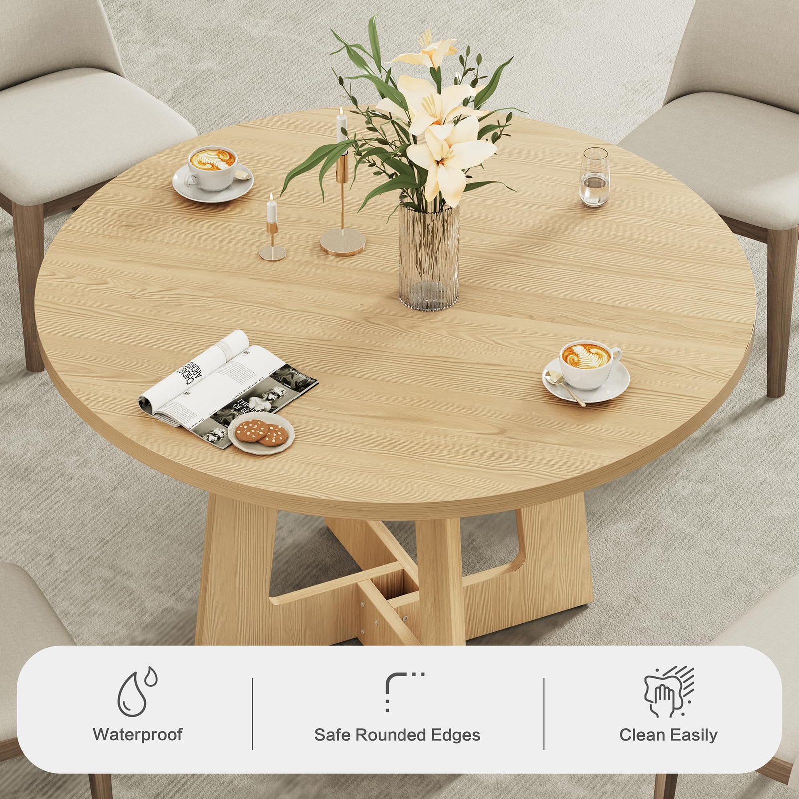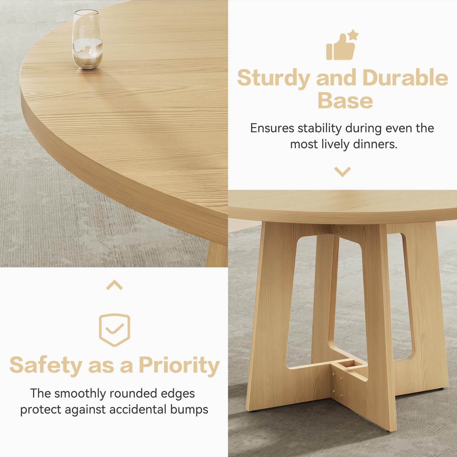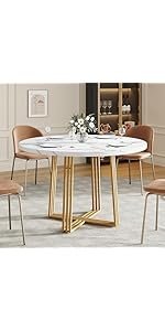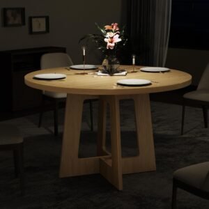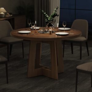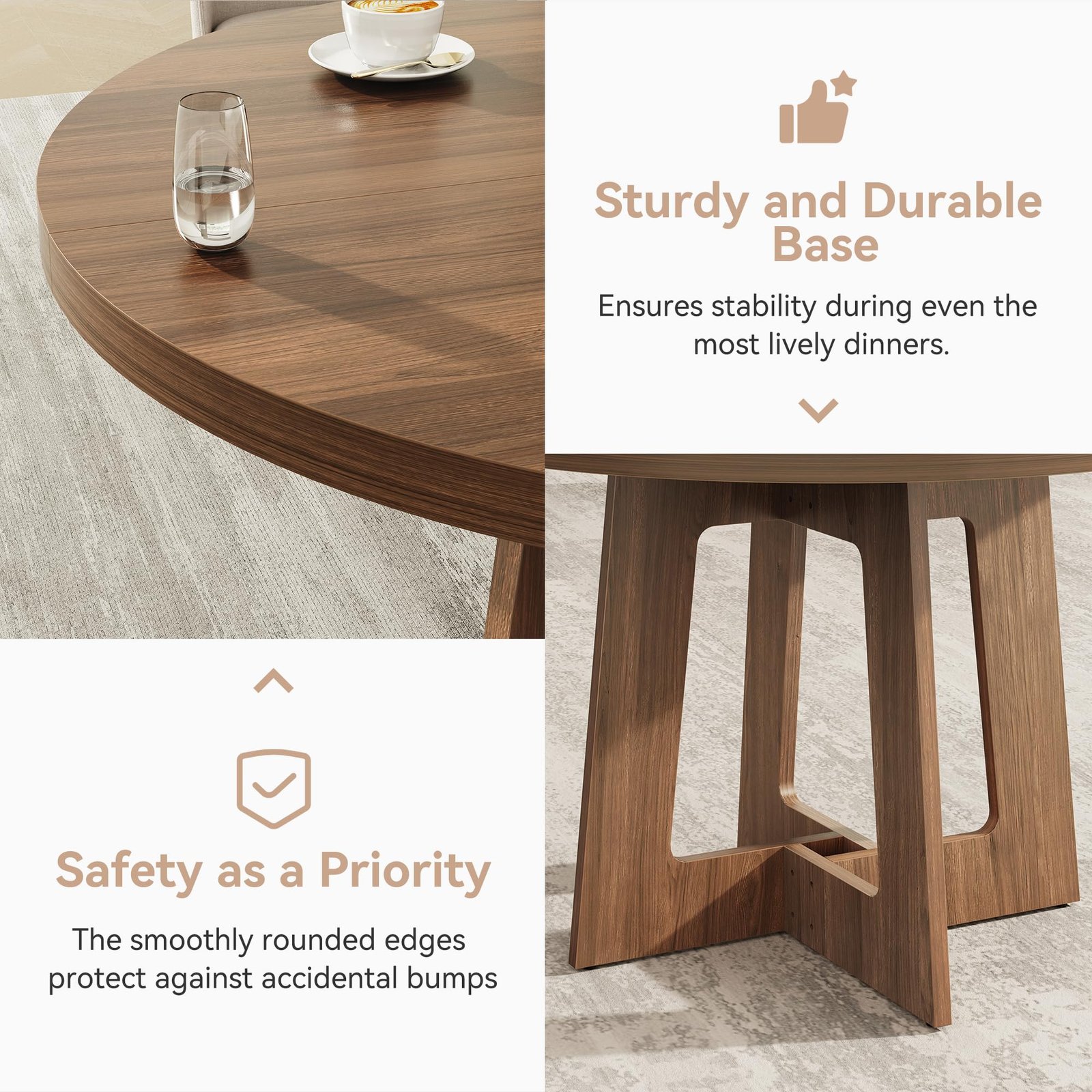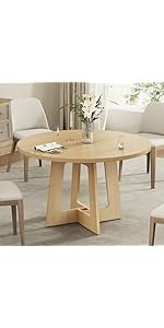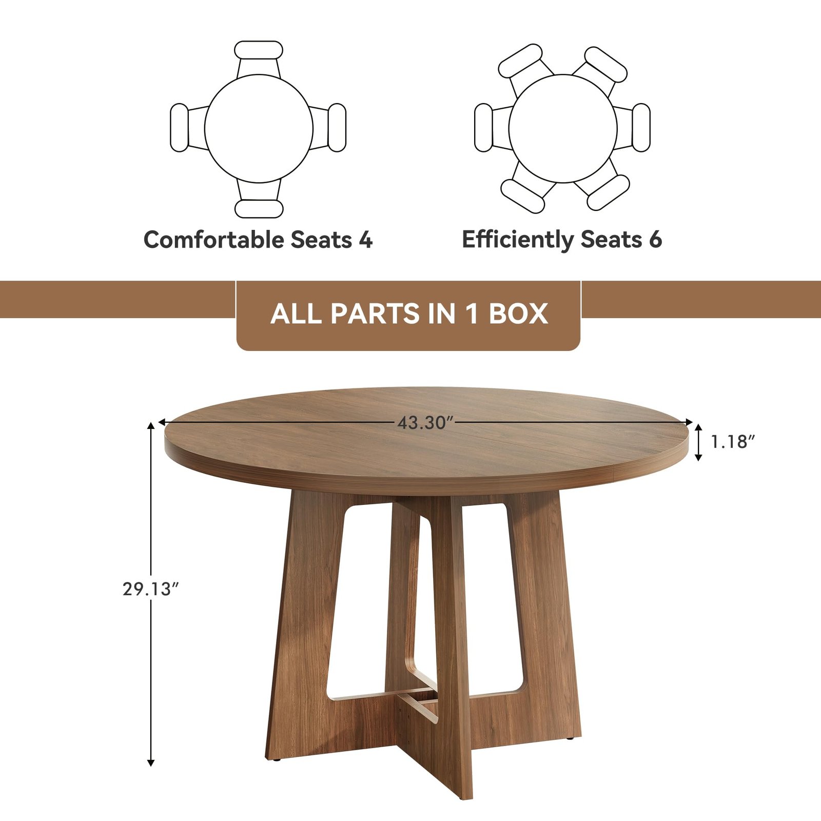 Brand:Sanyz Product Dimensions:43.3″D x 43.3″W x 29.13″H Color:Walnut Brown Recommended Uses For Product:Dining Table design:Dining Table Item Weight 68 Pounds:Frame Material Engineered Wood :Item Weight 68 Pounds :Frame Material Engineered Wood Top Material Type Engineered Wood:Shape Round :Top Material Type Engineered Wood :Shape Round · Spacious Tabletop for Gatherings – Indulge in family feasts or friendly gatherings with our round dining table, boasting a generous 43-inch diameter tabletop. Standing tall at 29.13 inches, it’s perfectly sized for intimate meals and larger parties alike, accommodating all your dining needs with ease. · Durable MDF Construction for Longevity – Crafted from robust 1.18-inch thick MDF board, Sanyz round table ensures exceptional durability and stability. This sturdy design guarantees a long-lasting dining companion that can withstand daily use without compromising its integrity. · Impressive Weight Capacity – With a maximum weight capacity of 300 pounds, Sanyz circular dining table effortlessly supports heavy dishes, centerpieces, and even multiple courses without buckling or wobbling. Enjoy peace of mind during your meals, knowing your table can handle it all. · Adjustable & Slip-Resistant Foot Pads – Experience versatility and stability with our adjustable foot pads, designed to accommodate uneven floors and ensure a secure fit. The slip-resistant feature adds an extra layer of safety, preventing accidental slides and ensuring a worry-free dining experience. · Seamless & Easy-to-Clean Design – Say goodbye to awkward gaps and hello to a sleek, continuous surface with our two-piece tabletop design. The smooth, waterproof, scratch-resistant, and heat-resistant finish makes cleaning a breeze – simply wipe with a damp cloth. Plus, assembly is a cinch, so you can enjoy your round kitchen table in no time! · 100% Satisfaction Purchase: Sanyz comes with an after-sale service. How to use the coverage service? Login to your account > choose “My orders” > find the order ID > click “Contact seller”.